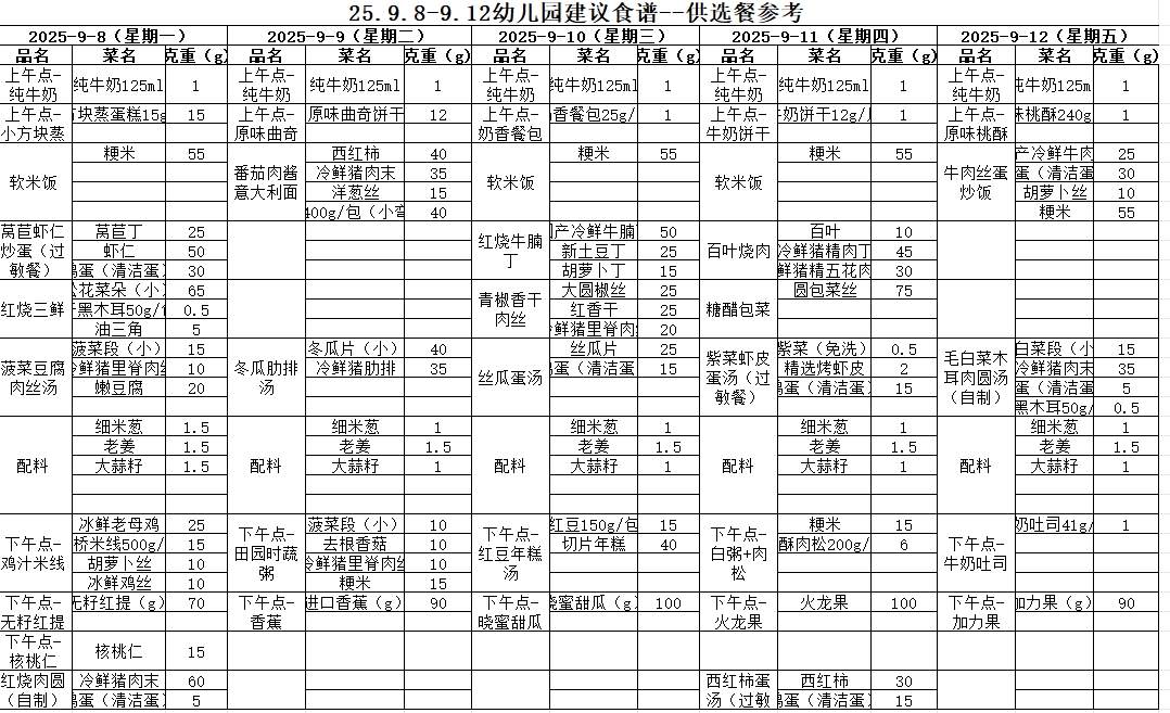 2025年秋学期第二周幼儿园食谱克重表(9月8日-9月12日)