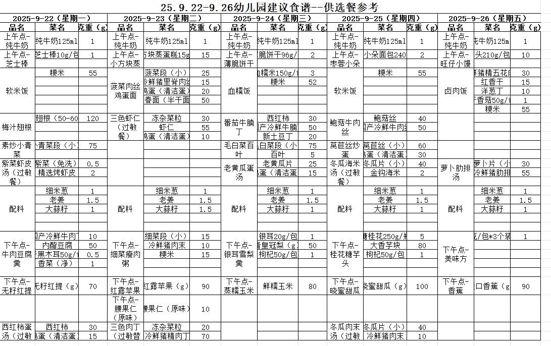 2025年秋学期第四周幼儿园食谱克重表(9月22日-9月26日)