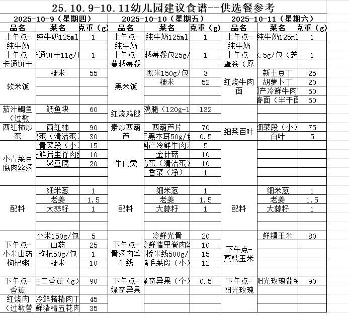2025年秋学期第六周幼儿园食谱克重表(10月9日-10月11日)